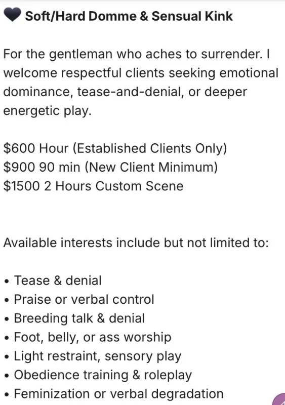 Domination - mild (BDSM) Face sitting Girlfriend experience (GFE) Intercourse - Oral Kissing - closed lips Massage - therapeutic Oral...
